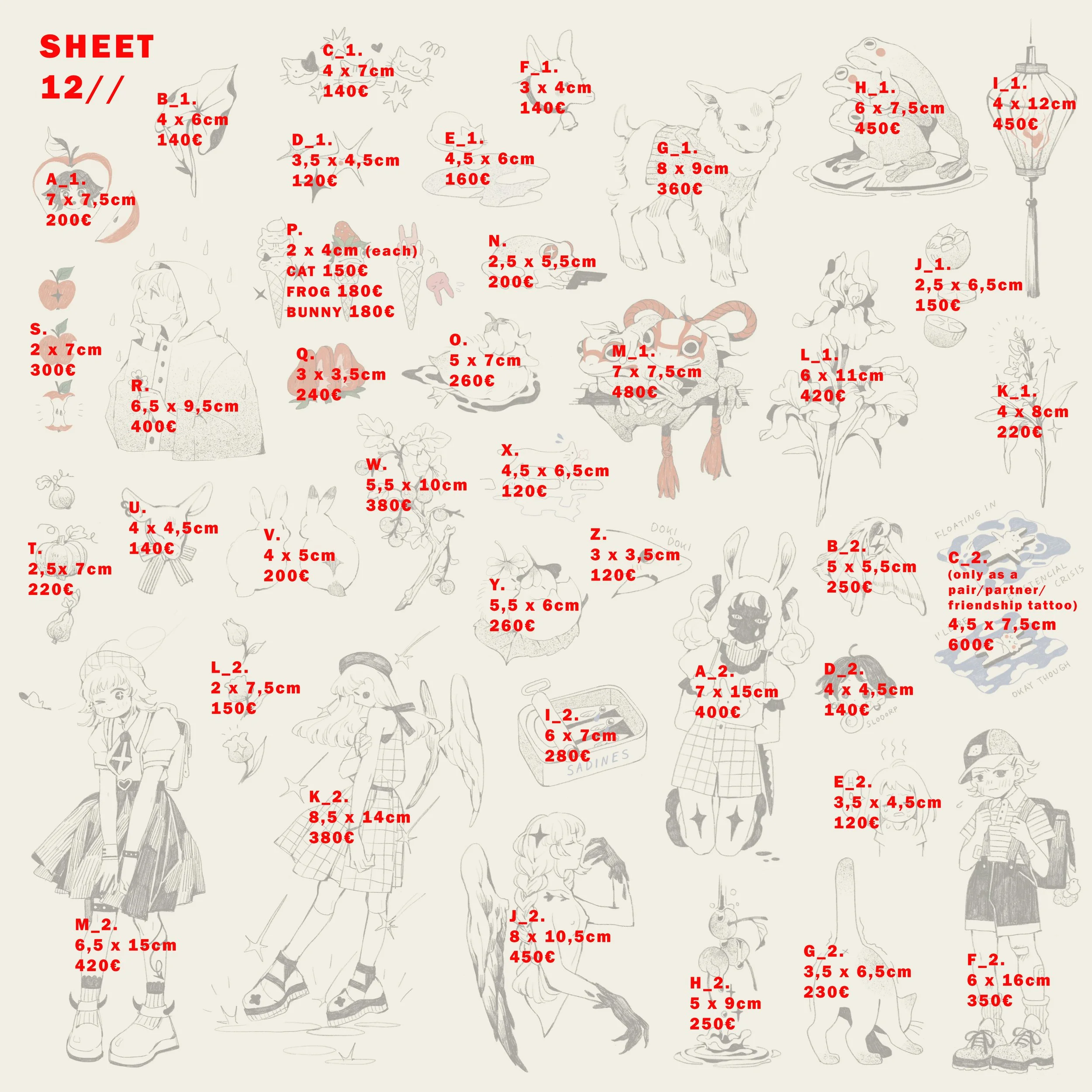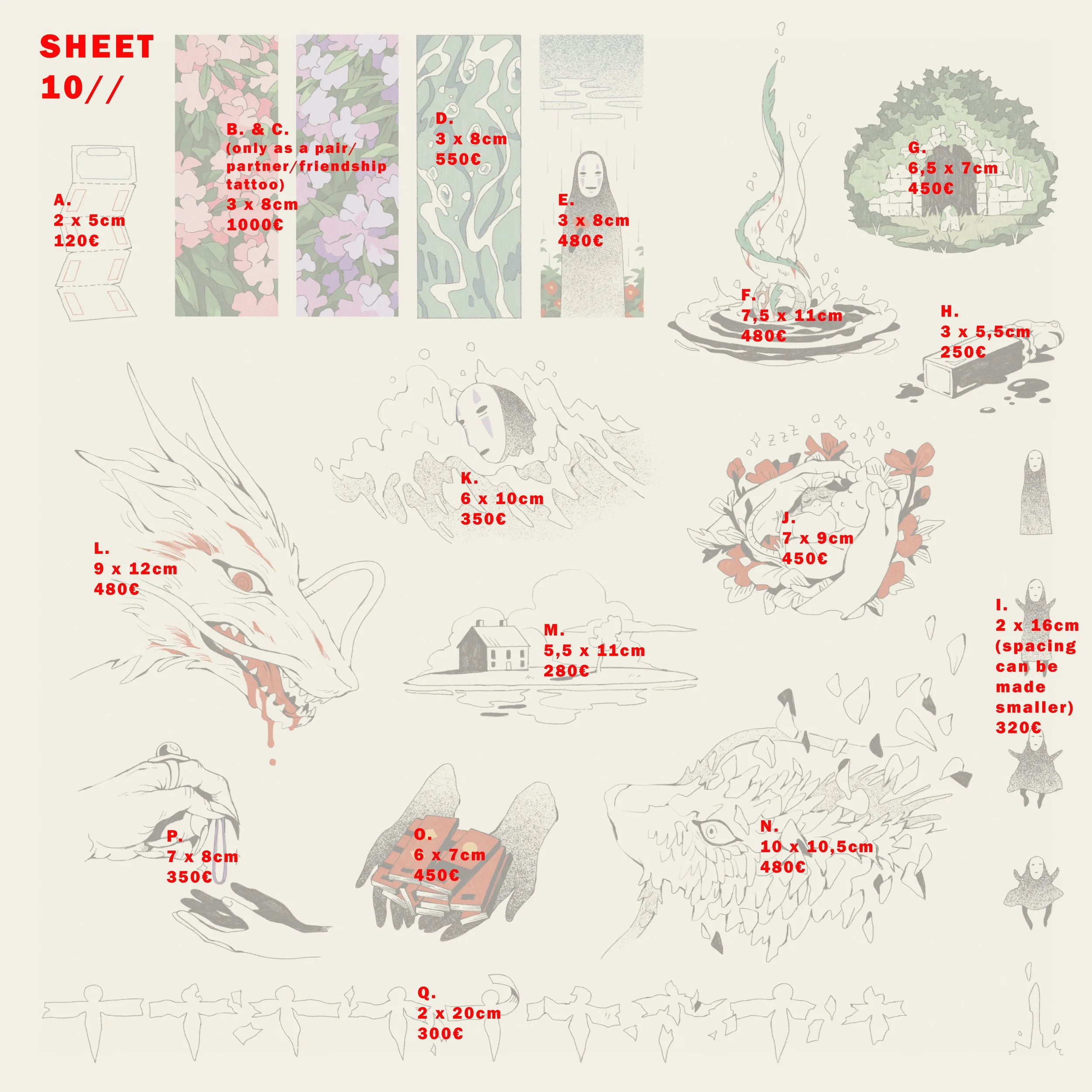 All sizes are minimum sizes. Prices include the tattooing session.